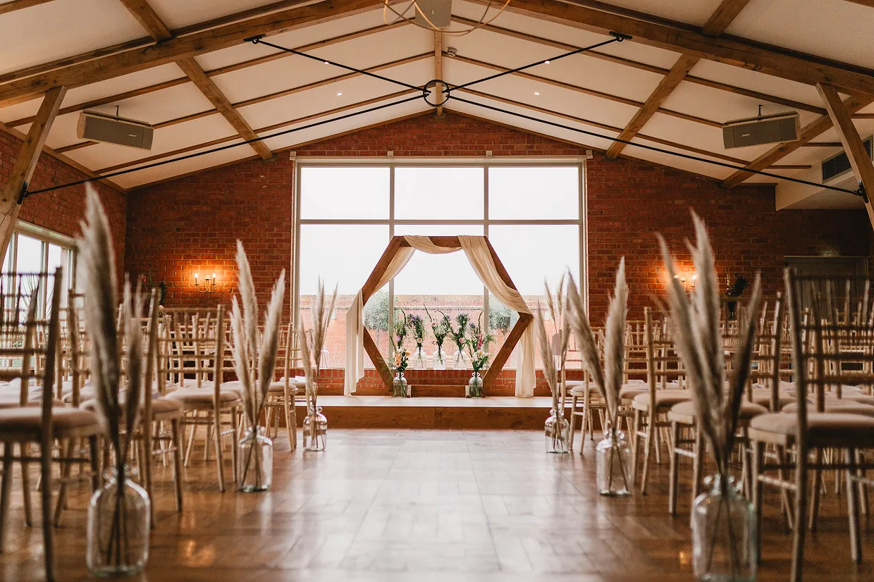 With exposed brick and stunning oak beams, our ceremony room has a spectacular yet relaxed, rustic charm. You will be framed by the dramatic picture window at the end of the aisle as you exchange your vows, and the views over the grounds offer the perfect backdrop for this special moment. Our civil ceremony licence is for up to 120 guests, but the flexible seating means it will look just right for more intimate ceremonies too.